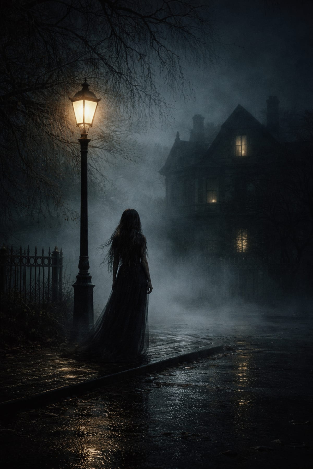 Under the failing light of the streetlamp, the ghost takes shape - slight, brittle, stitched together from darkness and memory. The world grants her only a few stolen minutes at a time. Always she stands in the same place. Always she lifts her gaze to the same house — the house that once held her laughter, her future, and the beloved who never spoke of what truly happened to her.